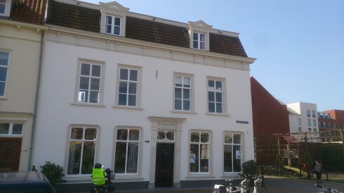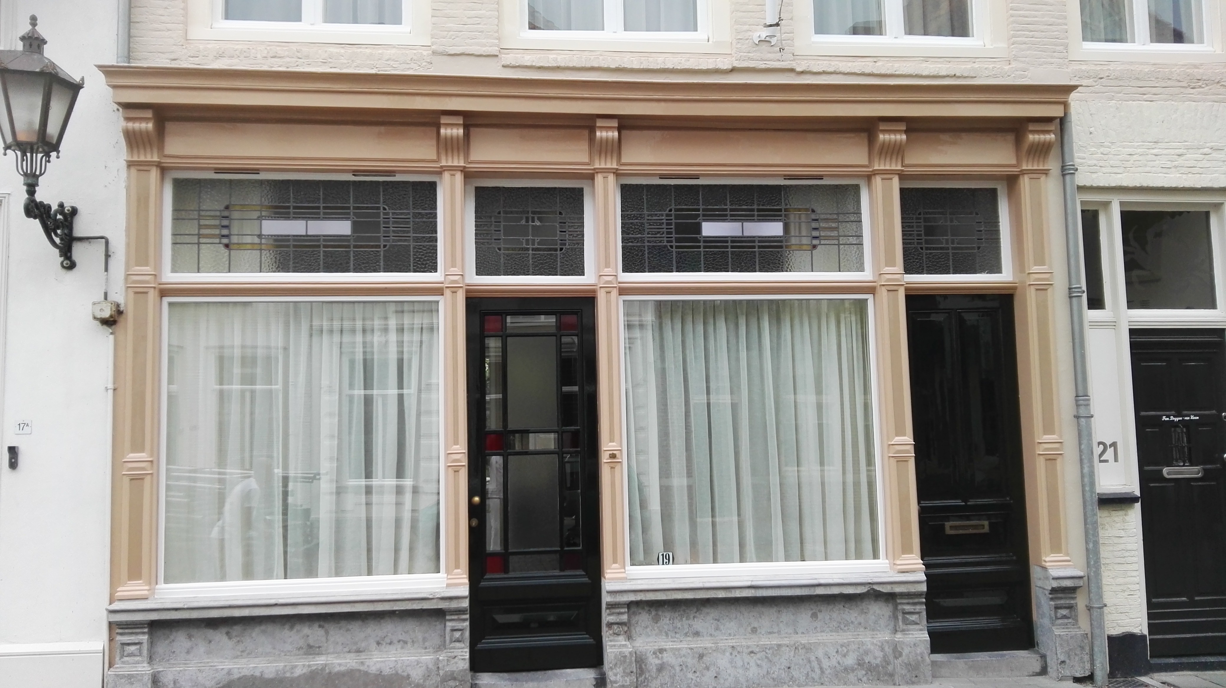 achtergevel na restauratie | gehele voorgevel na restauratie | detail voorgevel | plafond en muur hal tijdens restauratie | plafond en wand na schilderen |  |
